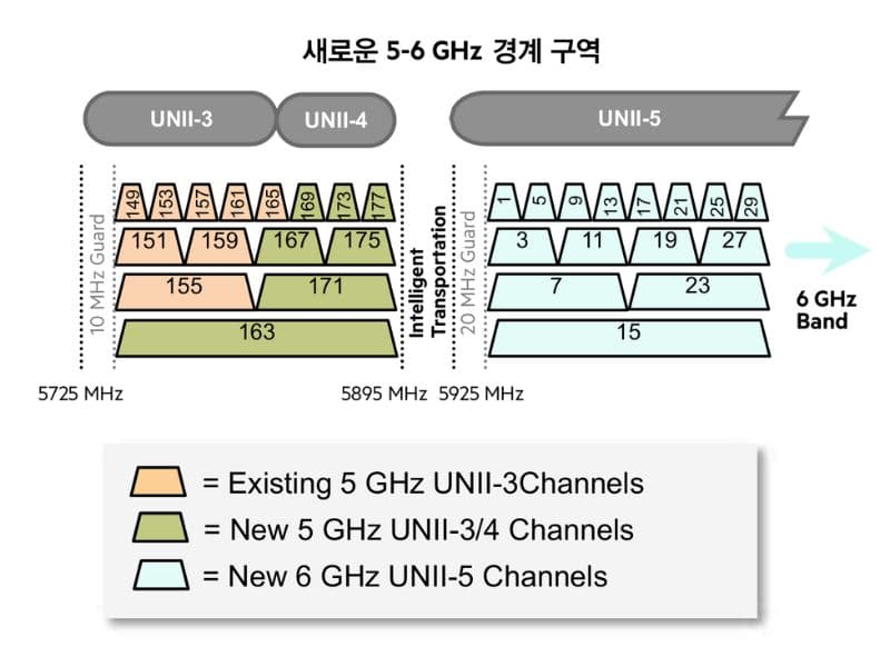 5GHz와 6GHz 대역은 불과 50MHz의 간격으로 분리되어 있습니다.